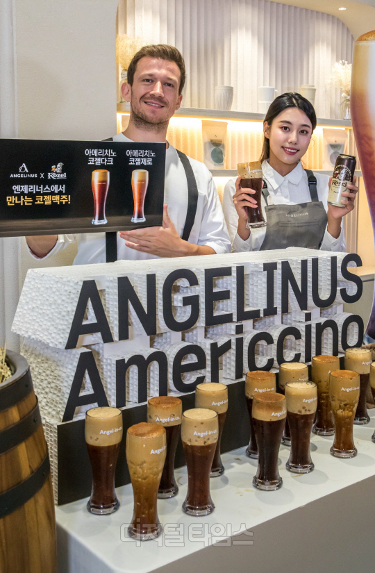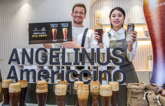 1일 서울 마포구 엔제리너스 홍대L7점에서 모델들이 엔제리너스 '아메리치노 코젤다크&코젤제로'를 선보이고 있다. 엔제리너스는 시그니처 음료인 아메리치노와 흑맥주 브랜드 코젤의 '코젤다크'를 접목시킨 신제품 2종을 출시했다.
