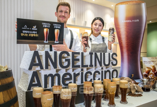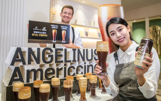 1일 서울 마포구 엔제리너스 홍대L7점에서 모델들이 엔제리너스 '아메리치노 코젤다크&코젤제로'를 선보이고 있다. 엔제리너스는 시그니처 음료인 아메리치노와 흑맥주 브랜드 코젤의 '코젤다크'를 접목시킨 신제품 2종을 출시했다.