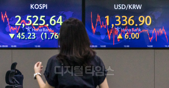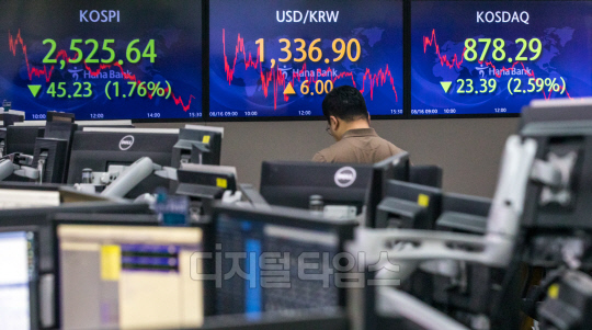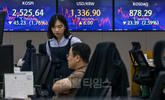 코스피가 전 거래일보다 45.23포인트 내린 2525.64로 장을 마친 16일 서울 중구 하나은행 딜링룸에서 직원들이 분주히 업무를 보고 있다. 이날 원·달러 환율은 6원 오른 1336.9원, 코스닥은 23.39포인트 내린 878.29로 마감했다.