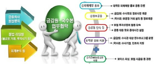 금감원은 리딩방 등에 의한 투자 사기, 불법 영업 행위 및 금융사 임직원의 횡령 혐의 등 사법 처리가 필요한 정보는 국수본과 적극적으로 공유하기로 했다. 국수본은 수사 또는 정보 수집 과정에서 확보한 불공정 거래, 금융사 불법 행위, 상장사 회계 부정 등의 정보를 금감원과 공유할 방침이다.