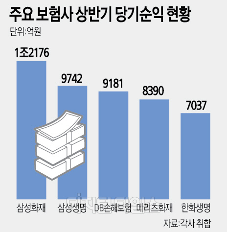 보험업계에 따르면 상반기 손해·생명보험사들의 연결 기준 순이익은 8조여원 수준으로 역대급 실적을 올린 것으로 나타났다. 손해보험사가 4조6000여억원, 생명보험사가 3조4000여억원 순이익을 냈다. 국내 5대 은행의 상반기 순이익에 육박하는 수준이다. 특히 회계기준 변화에 따른 수혜는 손해보험사들에서 컸다. 삼성화재는 상반기 순이익이 1조2166억원으로, 작년 동기 대비 27.3% 증가했다고 공시했다. 반기 기준 최대 실적이다. 삼성화재의 상반기 순익 규모는 생명보험업계 1위인 삼성생명을 뛰어넘었다. 메리츠화재 상반기 순이익도 8390억원으로 전년 동기 대비 25.2% 증가했다. DB손해보험은 상반기 순이익 9181억원을 기록했고 현대해상(5780억원), KB손해보험(5252억원)도 순이익 호조를 보였다.