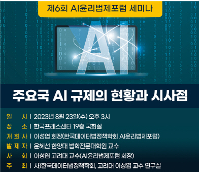 한국데이터법정책학회(회장 이성엽 고려대 교수)가 23일 오후 서울 중구 한국프레스센터에서 '주요국 AI 규제의 현황과 시사점'을 주제로 제6회 AI 윤리법제포럼을 개최한다. 한양대학교 법학전문대학원 윤혜선 교수가 주제발표를 한다.
