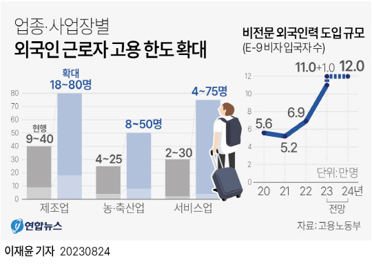 정부는 E-9 비자로 입국하는 비전문 외국인력 규모를 2020년 5만6000명, 2021년 5만2000명, 2022년 6만9000명으로 늘린 이후 올해 11만명으로 대폭 확대한 바 있다.