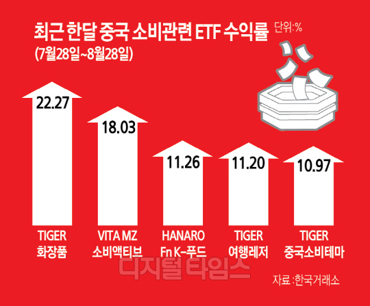 최근 부동산 기업의 채무불이행(디폴트) 등 위험이 부각되며 글로벌 증시를 출렁이게 만들었던 중국발 리스크가 잦아드는 분위기다. 중국 경기의 더딘 회복에 대한 우려는 여전하지만 이와 별개로 국내 상장지수펀드(ETF) 시장 수익률 상위 종목을 석권하고 있는 건 중국 소비 관련 상품이다. 단체여행 수혜주에도 온기가 반영되고 있다.