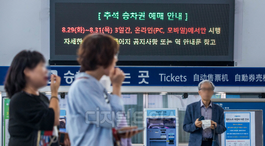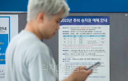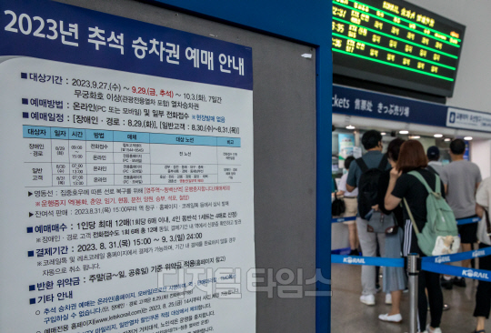 2023년 추석 승차권 예매가 시작된 29일 서울역 대합실에 안내문이 붙어있다. 코레일은 이날 부터 경로·장애인을 대상으로 전화 및 온라인예매를 진행하고, 30일은 일반에 경부·경전·동해·충북·중부내륙·경북선, 31일은 호남·전라·강릉·장항·중앙·태백·영동(일부역 제외)·경춘선 승차권 예매를 진행한다.