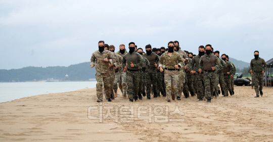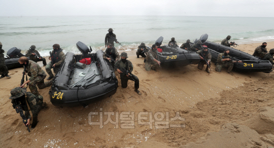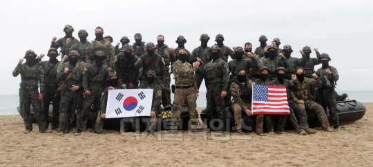 지난 28일 강원도 양양군 해상침투전술훈련장에서 'UFS/TIGER' 일환 특전사 연합 해상침투 훈련이 진행된 가운데 육군특수전사령부, 주한미특수작전사령부 장병들이 훈련을 마친 뒤 기념촬영을 하고 있다.