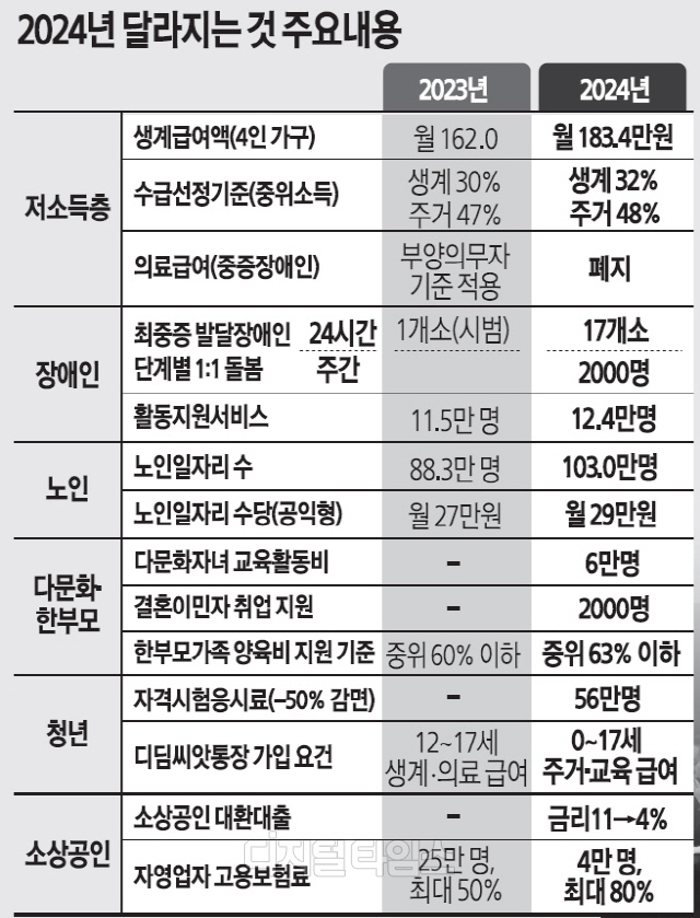 文정부 5년 인상폭보다 높아 4인 가족 162만원→183만원 지급 대상 3만9000가구 추가 노인일자리 수당도 7% 올려
