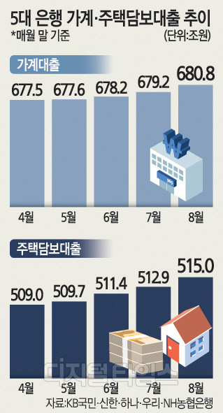 3일 금융권에 따르면 5대 은행(KB국민·신한·하나·우리·NH농협)의 지난달 말 가계대출 잔액은 680조8120억원으로 집계됐다. 7월 말(679조2208억원)과 비교해 한 달만에 1조5912억원 늘었다