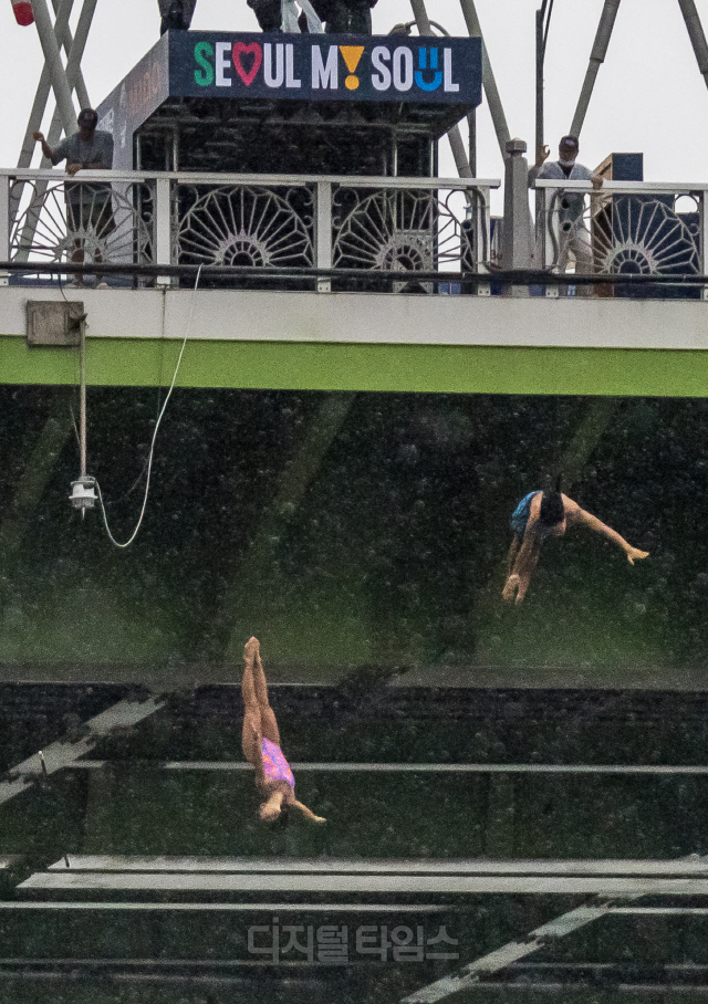 '한국인 1호 하이다이빙 선수' 최병화와 하이다이버 산티아 펜니시가 13일 오후 서울 양화대교에서 열린 '레드불 서울다이브'에서 연기를 선보이고 있다.