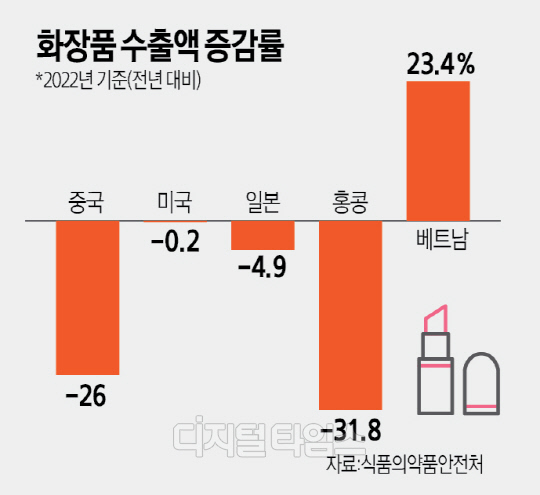 식약처에 따르면 지난해 화장품 수출액을 2021년과 비교해 보면, 수출액 규모 1위인 중국은 26% 수출액이 급감했다. 2위인 미국은 0.2% 줄었고 3위인 일본은 4.9% 줄었다. 4위인 홍콩은 31.8%나 감소했다. 반면 5위인 베트남은 23.4% 급증한 것으로 나타났다.