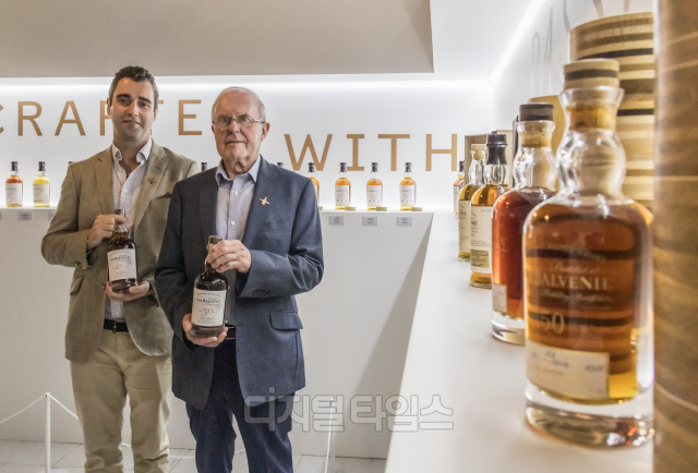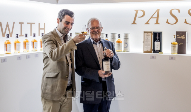 6일 서울 강남구 앤드트리메타에서 열린 '정통 수제 싱글몰트 위스키 발베니 헤리티지 전시'에서 데이비드 스튜어트(오른쪽) 발베니 몰드 마스터와 찰리 멧칼프 글로벌 앰버서더가 전시장에서 포즈를 취하고 있다.