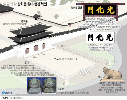 '임금의 길' 광화문 월대·현판 복원 문화재청, 15일 오후 5시 광화문 앞 광장에서 기념행사 금빛 활자로 바뀌는 광화문 현판…10년 논쟁 종지부 찍을까?