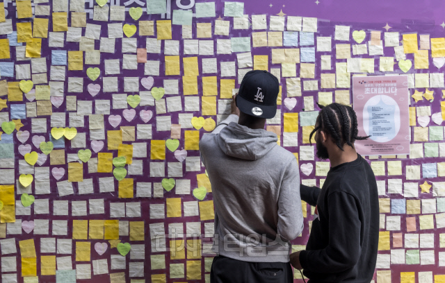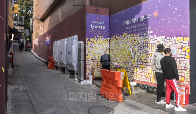 이태원 참사 1주기를 일주일 앞둔 22일 서울 용산구 이태원 참사 골목에 설치된 '10.29 이태원 참사 기억의 길'에 추모 메시지가 붙어 있다. 이 골목은 10.29 기억과 안전의 길로 조성 공사 중이다.