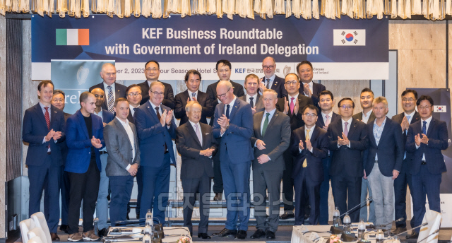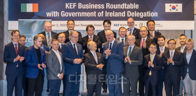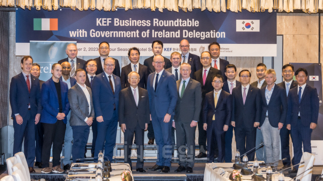 손경식 한국경영자총협회장과 사이먼 코브니 아일랜드 기업통상고용부 장관 등 참석자들이 2일 서울 종로구 포시즌스호텔 누리볼룸에서 열린 아일랜드 대표단 초청 경총 기업인 간담회에서 기념촬영을 하고 있다.