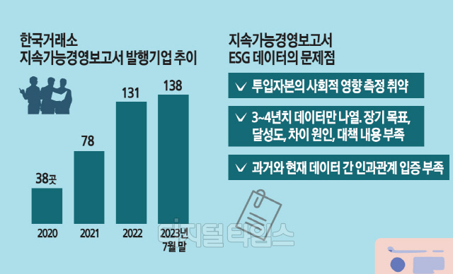 한국거래소 통계 포털을 보면 코스피 상장사 중 보고서를 발행한 기업은 2020년 38곳, 2021년 78곳, 지난해 131곳에서 올해 7월 말 현재 138곳으로 2년새 급증했다. 최근 국제회계기준(IFRS)의 국제지속가능성기준위원회(ISSB), 유럽연합(EU)의 기업 지속가능성 보고 지침(CSRD), 미국 증권거래위원회(SEC) 기후공시 의무화 등 세계적으로 ESG 정보공시 규제에 대한 도입이 본격화하고 있기 때문이다.