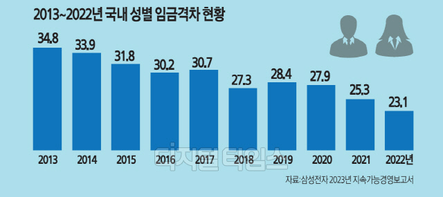 그는 이에 가장 근접하게 보고서를 작성한 기업으로 삼성전자와 SK하이닉스를 꼽았다. 비교적 자료를 상세하게 다룬 삼성전자는 성별 임금 격차의 경우 10년치 데이터를 보여주고 있다. 임금 격차가 2013년 34.8%에서 2022년 23.1%로 좁아졌지만 앞으로 고위직급 여성 비율을 높여서 개선하겠다고 선언했다. SK하이닉스는 주요 항목별로 2030년 목표를 설정하고 현재 진도율과 차년도 목표를 밝히고 있다.