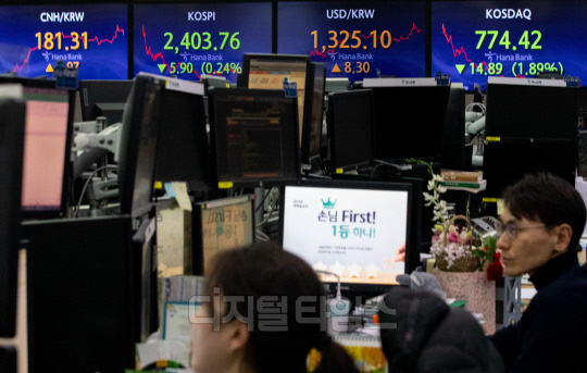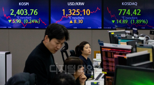 코스피가 전 거래일보다 5.9포인트 내린 2403.76으로 장을 마친 13일 서울 중구 하나은행 딜링룸에서 직원들이 분주히 업무를 보고 있다. 이날 원·달러 환율은 8.3원 오른 1325.1원, 코스닥은 14.89포인트 내린 774.42로 마감했다.