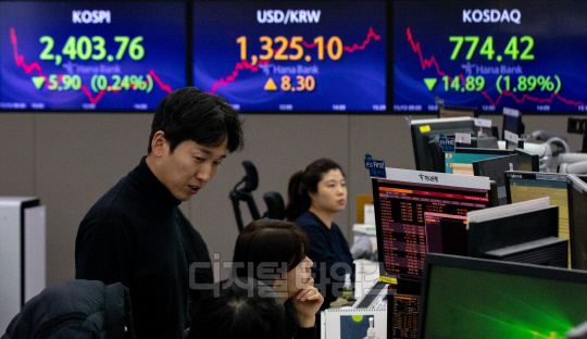 코스피가 전 거래일보다 5.9포인트 내린 2403.76으로 장을 마친 13일 서울 중구 하나은행 딜링룸에서 직원들이 분주히 업무를 보고 있다. 이날 원·달러 환율은 8.3원 오른 1325.1원, 코스닥은 14.89포인트 내린 774.42로 마감했다.