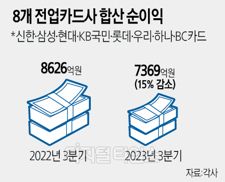 올 3분기 신한·삼성·현대·KB국민·롯데·우리·하나·BC카드 등 8개 전업카드사의 합산 순이익은 7369억원이었다. 이는 전년 동기(8626억원) 대비 15% 감소한 수준이다. 누적 기준으로도 2조781억원의 순익으로 전년(2조3530억원)과 비교해 11.7% 급락했다. 4분기에도 실적 악화가 지속할 전망이다. 고금리 기조 속 여전채 발행 시장 여건이 개선되지 않아 자금 조달이 여전히 어려운 상황이다.