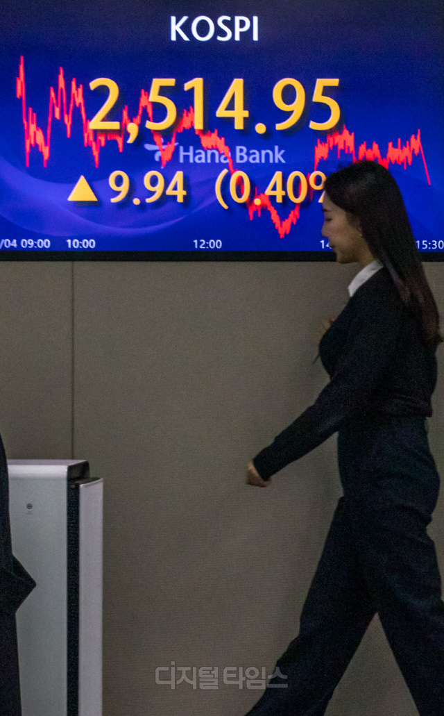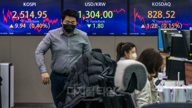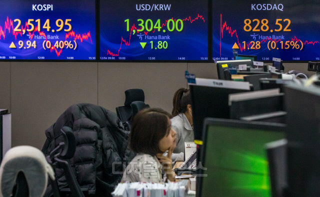 코스피가 전 거래일보다 9.94포인트 오른 2514.95로 장을 마친 4일 서울 중구 하나은행 딜링룸에서 직원들이 분주히 업무를 보고 있다. 이날 원·달러 환율은 1.8원 내린 1304원, 코스닥은 1.28포인트 오른 828.52로 마감했다.
