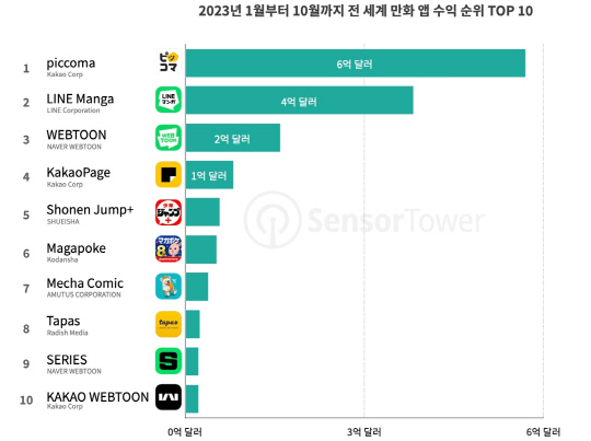 전 세계 도서 만화 앱의 인앱 구매 수익은 2019년부터 현재까지 계속 성장하고 있다. 2020년 도서 만화 앱의 수익은 17억 달러로 57% 성장했으며 2021년과 지난해에는 각각 43%와 10% 증가해 26억 달러에 달했다. 올해 1~10월 도서 만화 앱은 전 세계에서 지난해 같은 기간보다 8% 성장한 24억 달러의 수익을 올렸고 올해 전체 수익은 28억 달러를 돌파할 것으로 예상된다.