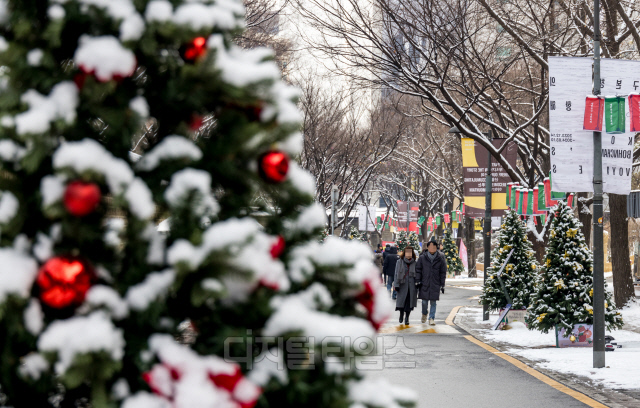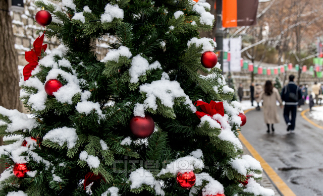 성탄절인 25일 서울 중구 덕수궁 돌담길에 세워진 크리스마스 트리에 눈이 쌓여 있다.