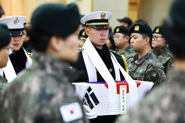 29일 오전 서울 동작구 국립서울현충원 현충관에서 열린 6·25전사자 발굴유해 합동 봉안식에서 국군 의장대가 유해를 봉송하고 있다.