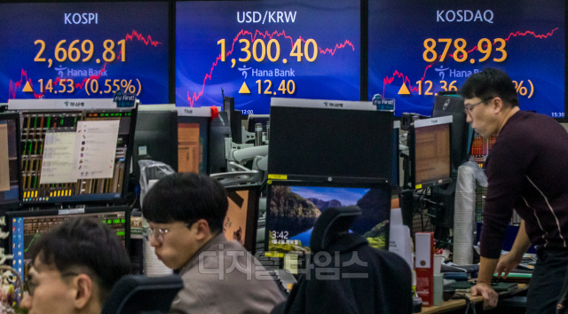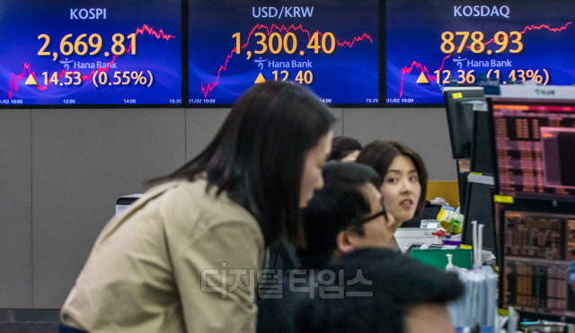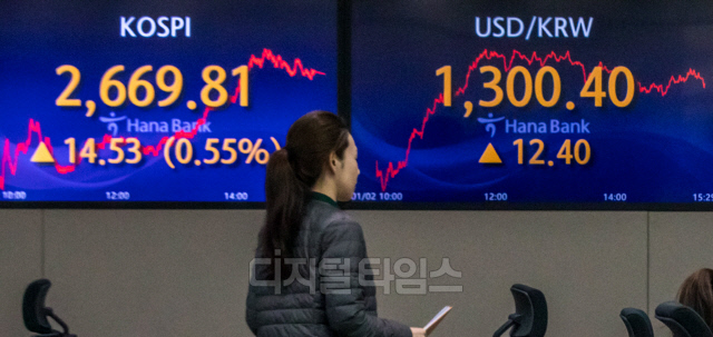 갑진년 새해 첫 거래일인 2일 서울 중구 하나은행 딜링룸에서 직원들이 분주히 업무를 보고 있다. 이날 코스피 지수는 전 거래일 대비 14.53포인트 오른 2669.81, 코스닥은 12.36포인트 오른 878.93, 원·달러 환율 12.4원 오른 1300.4원으로 장을 마쳤다.