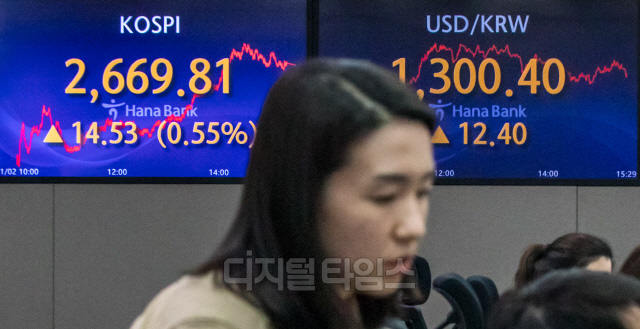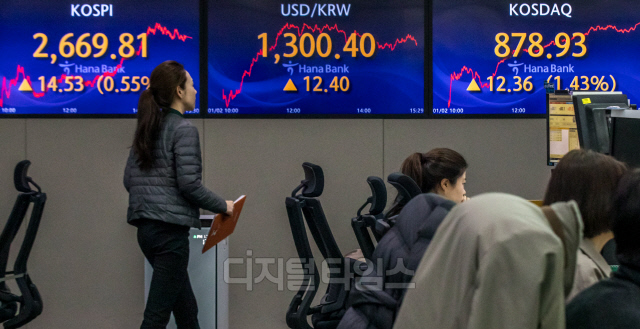갑진년 새해 첫 거래일인 2일 서울 중구 하나은행 딜링룸에서 직원들이 분주히 업무를 보고 있다. 이날 코스피 지수는 전 거래일 대비 14.53포인트 오른 2669.81, 코스닥은 12.36포인트 오른 878.93, 원·달러 환율 12.4원 오른 1300.4원으로 장을 마쳤다.