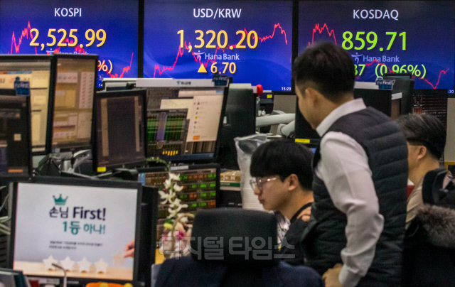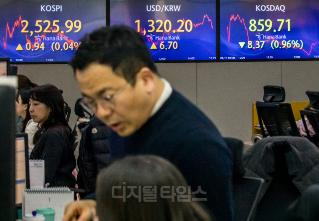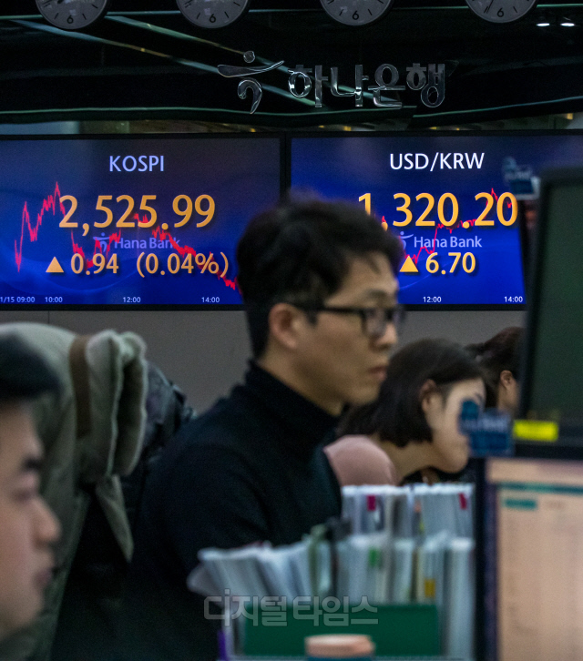 코스피가 전 거래일보다 0.94포인트 오른 2525.99로 장을 마친 15일 서울 중구 하나은행 딜링룸에서 직원들이 분주히 업무를 보고 있다. 이날 원·달러 환율은 6.7원 오른 1320.2원, 코스닥은 8.37포인트 내린 859.71로 마감했다.