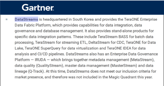 회사는 앞서 2014년 ETL(추출·변환·적재) 및 스트리밍 솔루션 '테라스트림'으로 가트너 매직쿼드런트에 등재됐고, 2021년에도 데이터 품질 관리 솔루션 '퀄리티스트림'으로 아너러블 벤더로 선정된 바 있다.