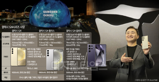 갤S24 시리즈 모델 종류는 △갤럭시S24 △갤럭시S24 플러스 △갤럭시S24 울트라 등 3종으로, 화면 크기는 각각 6.2인치, 6.7인치, 6.8인치다. '스마트폰 두뇌'라고 불리는 모바일 AP(애플리케이션 프로세서)도 역대급 사양이다. 주목되는 부분은 '엑시노스'의 성능이다. 갤S24 울트라 모델에는 퀄컴의 '갤럭시용 스냅드래곤8 3세대', 일반·플러스 모델에는 '엑시노스2400'이 각각 탑재된다. 퀄컴과의 협력으로 갤럭시에 최적화된 스냅드래곤8 3세대 칩셋은 뛰어난 NPU(신경망처리장치) 성능을 제공해 AI 프로세싱을 효율적으로 돕는다. 삼성전자의 AP 엑시노스 시리즈는 '엑시노스 2200'의 안정성 논란 이후 절치부심해 2년 만에 선보인 만큼 갤S24가 성패 여부의 관건이 될 전망이다.