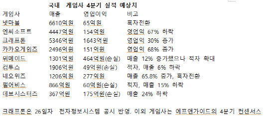 29일 금융정보업체 에프앤가이드와 게임업계에 따르면 작년 4분기 매출은 △넷마블 6610억원(3.8%↓) △엔씨소프트 4474억원(18%↓) △컴투스 1906억원 (6.7%↓) △펄어비스 866억원(15%↓) △데브시스터즈 367억원(24%↓) △크래프톤 5346억원(12%↑) △카카오게임즈 2496억원(5.9%↑) △위메이드 1301억원(12.9%↑) △네오위즈 1206억원(65%↑) 등으로 추정된다. 이 중 넷마블, 컴투스, 데브시스터즈, 위메이드는 적자를 기록한 것으로 추산된다.