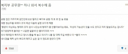 같은 사이트에 지난 14일 오후 6시22분 올려진 '복지부 공무원 ○○ 하나 와서 복수해 줌' 글에는 복지부 공무원이 위장 내시경 검사를 하러 왔는데 정상 조직을 떼어낸 후 악성 종양 가능성이 있다고 말했더니 안색이 안 좋아져서 나갔다는 경험담을 소개했다.