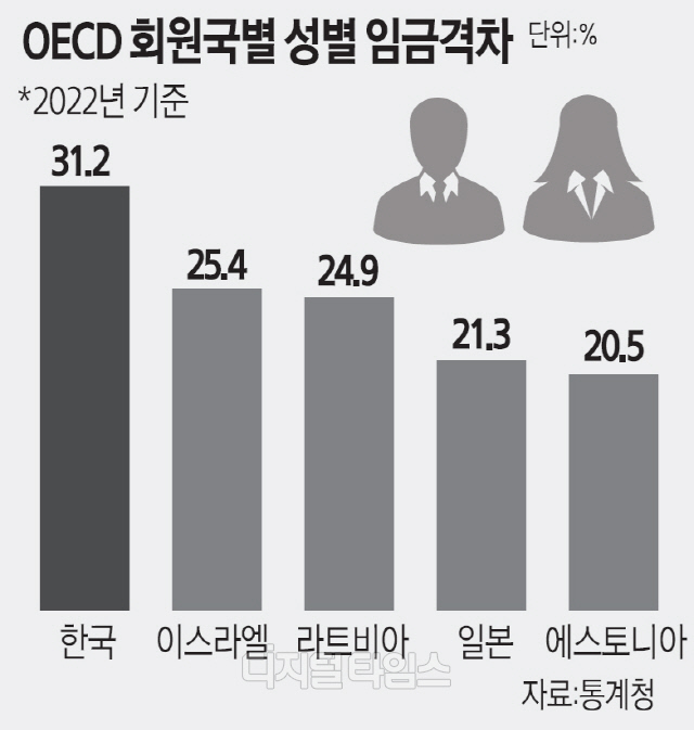 구체적으로 2022년 한국의 성별 임금 격차(31.2%)는 이는 OECD 평균(12.1%)대비 2.6배에 달하는 수준이다. 한국 다음 순위로는 이스라엘, 라트비아, 일본, 에스토니아로 모두 20%대에 머물러 한국과 격차가 컸다.