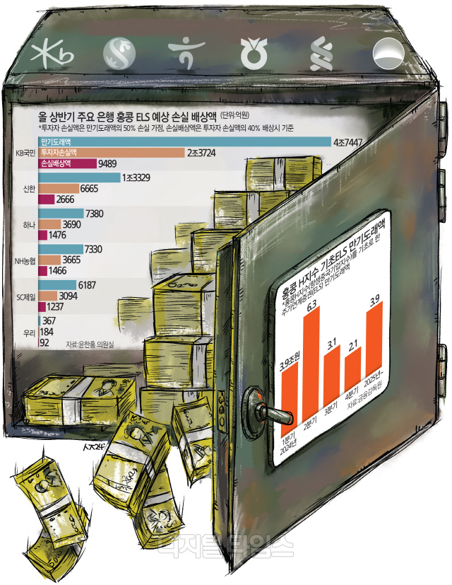 하반기인 7월 만기도래분을 합산하면 손실 배상액은 2조97억원으로 2조원을 넘는다. 상반기 손실 배상액 대비 약 3600억원 증가한 액수로, 이런 증가세는 계속될 전망이다. 은행들은 구체적인 액수를 공개하고 있지 않지만 국민은행의 배상액이 가장 크고, 이어 신한, 농협, 하나, 제일, 우리은행 순이다. 올해 1∼7월 H지수 ELS 만기 도래 규모는 10조483억원, 손실액은 5조242억원(손실률 50% 기준)이다.
