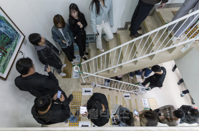 22대 총선 사전투표가 시작된 5일 서울 종로구 사직동주민센터에 마련된 사전투표소에서 시민들이 투표를 하기 위해 기다리고 있다.