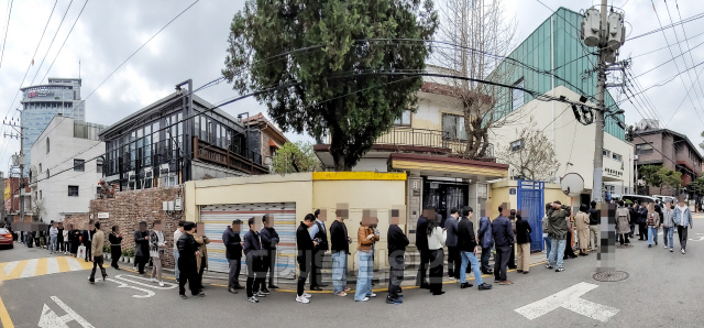 22대 총선 사전투표가 시작된 5일 서울 종로구 사직동주민센터에 마련된 사전투표소에서 시민들이 투표를 하기 위해 기다리고 있다. 파노라마 촬영.