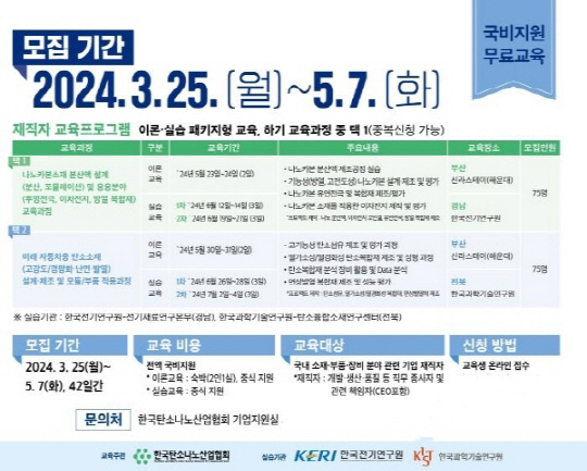 교육대상은 '국내 소재부품장비 분야 관련기업 재직자(개발생산품질 등 직무종사자 및 관련책임자(CEO포함)이다. 2개 과정 모두 이론교육과 실습교육으로 구성되어 있고, 모집인원은 나노카본소재 과정 75명, 탄소소재 과정 75명이다.