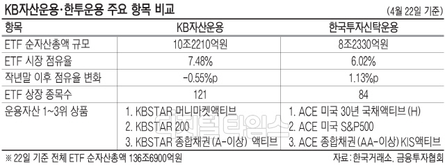 KB는 순자산총액 1조원 넘는 상품 3개를 보유한 것이 강점으로 꼽힌다. 머니마켓액티브, 200, 종합채권(A-이상)액티브 3개 상품이 각각 순자산총액 1조원을 넘겼다. 한투운용이 보유한 1조원 이상 상품은 미국30년국채액티브(H) 뿐이다.