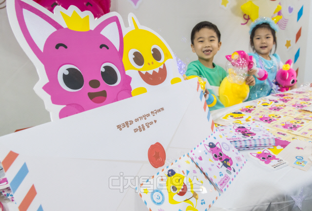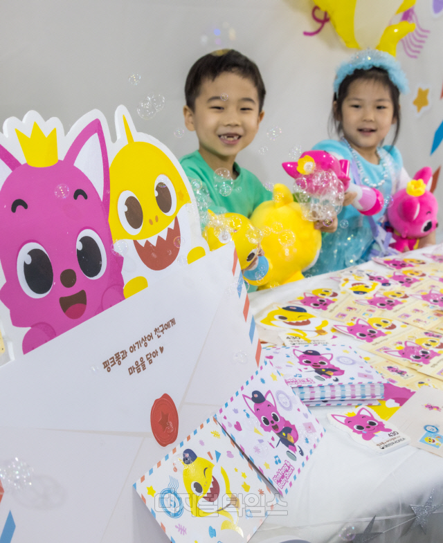 2일 서울중앙우체국 우표박물관에서 어린이 모델들이 핑크퐁과 아기상어 기념우표를 선보이고 있다. 과학기술정보통신부 우정사업본부는 전 세계 어린이 인기 캐릭터인 핑크퐁과 아기상어 기념우표 80만 장을 오는 3일부터 판매한다.