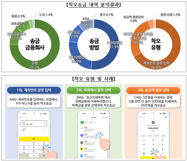 송금 정보 입력 과정에서 계좌번호를 잘못 입력(66.8%)하거나, '최근 이체 목록' 등에서 이체 대상을 잘못 선택(28.3%)해 착오송금이 주로 발생했다.