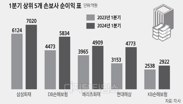 15일 보험업계에 따르면 상위 손해보험사 5곳(삼성·DB·메리츠·현대·KB)의 올 1분기 단순 합산 당기순이익은 2조5458억원으로 전년(2조253억원) 대비 25.7% 증가했다.