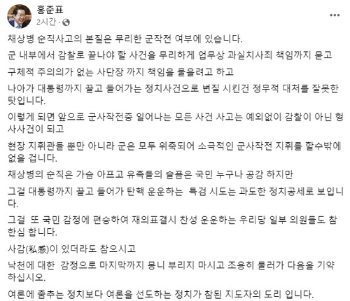 홍 시장은 "채상병의 순직은 가슴 아프고 유족들의 슬픔은 국민 누구나 공감한다"면서도 "대통령까지 끌고 들어가는 정치 사건으로 변질시킨 건 정무적 대처를 잘못한 탓"이라고 말했다.