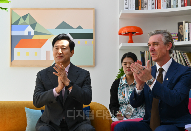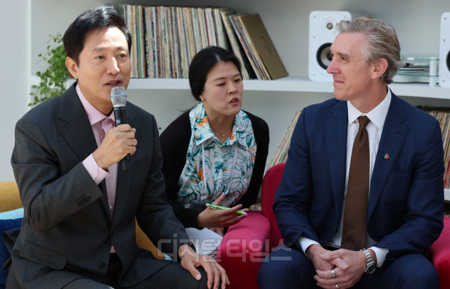 오세훈(왼쪽) 서울시장과 데이브 스티븐슨 에어비엔비 최고사업책임자(CBO)가 28일 오전 서울 용산구 한강대교 전망호텔 '스카이 스위트'에서 열린 사전 홍보 이벤트에 참석해 간담회를 갖고 있다.
