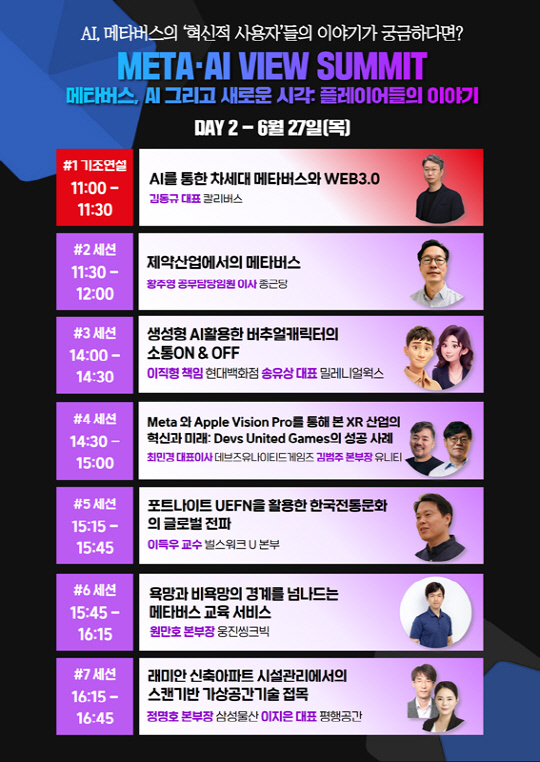 디지털 전환을 선도하는 기업들이 한자리에 모이는 'META·AI View 서밋'이 6월 26일과 27일, 코엑스 A홀에서 개최된다. 이번 서밋은 '메타버스, AI 그리고 새로운 시각: 플레이어들의 이야기'라는 주제로 각 분야에서의 AI, 메타버스, 디지털 트윈, XR 등을 적용한 혁신적인 기업들의 경험과 활용 사례를 공유하고 인사이트를 얻을 수 있는 자리가 될 것으로 예상된다.