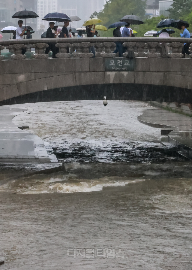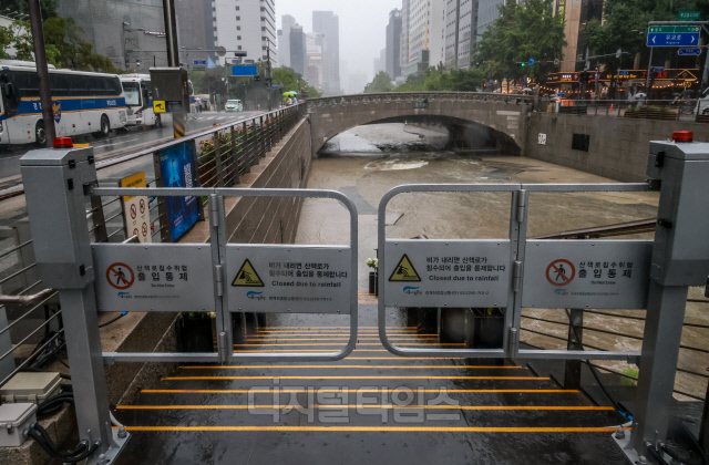 서울을 포함한 수도권 등 일부 지역에 호우주의보가 내려진 2일 서울 청계천의 출입이 통제되고 있다.