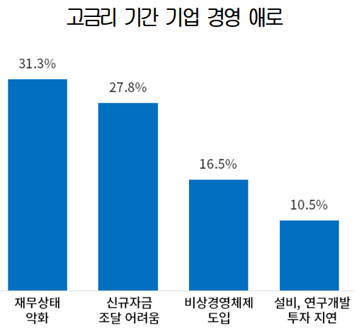 '신규자금 조달 어려움'을 꼽은 기업이 27.8%로 뒤를 이었으며, '비용 절감을 위한 비상경영체제 도입'(16.5%), '설비투자, 연구개발 지연·중단'(10.5%) 등의 순이었다.