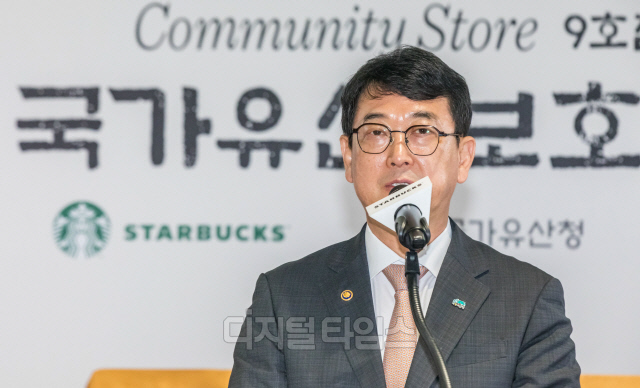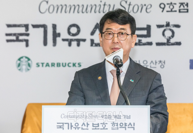 최응천 국가유산청장이 11일 서울 중구 스타벅스 아카데미에서 열린 '스타벅스 커뮤니티 스토어 9호점 개점 개념 국가유산 보호 협약식'에서 축사를 하고 있다.