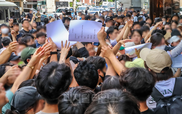 티몬·위메프 판매대금 정산 지연 사태가 이어진 26일 피해자들이 서울 강남구 티몬 신사옥에서 환불을 받기 위한 서류를 받고 있다.